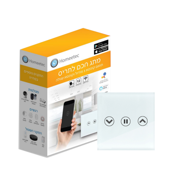 מפסק חכם לתריס חשמלי לשליטה בתריסי החשמל בביתך, עשוי זכוכית קריסטלית בעיצוב מינימליסטי וגימור יוקרתי. לצד ההפעלה החשמלית על ידי מגע טאצ', ניתן להפעיל ולשלוט מאפליקציה / שלט / מסך שליטה מרכזי. המפסק תוכנן ועוצב באופן כזה שנגיעה קלה על אחד הלחצנים בפאנל תבצע פעולה ממושכת של עלייה וירידה באופן אוטומטי, ללא צורך בלחיצת אצבע ממושכת. מתג תריס חכם ניתן לרכישה והרכבה ללא צורך בתשתית נוספת ומאפשר שליטה באמצעות שלט או באמצעות הסמארטפון בחיבור לראוטר הביתי. כמו כן, המתג ניתן להוספה כאחד האביזרים בתוך מגוון מערכות הבית החכם ובאמצעות עוזרת קולית Alexa או Google Home ניתן לשלוט על התריס או קבוצה של אביזרים על ידי פקודה קולית – לצפייה בסרטון.